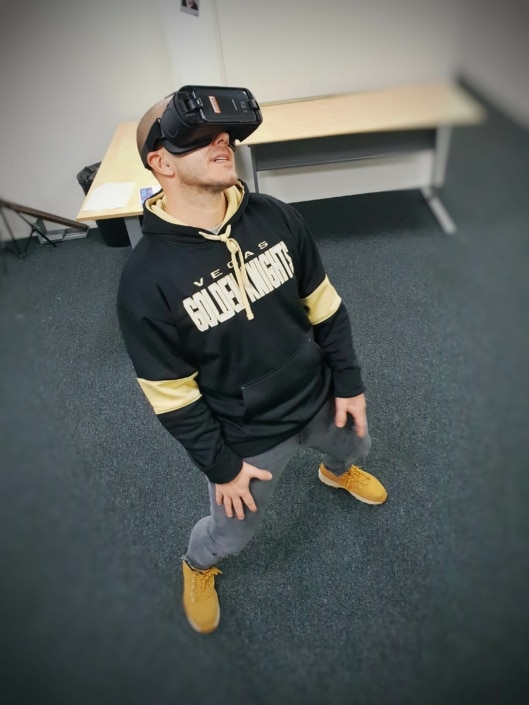 Équipement du casque VR et découverte de l’environnement. Le participant se retrouve au sommet d’un immeuble, avec une vue vertigineuse à 360°.